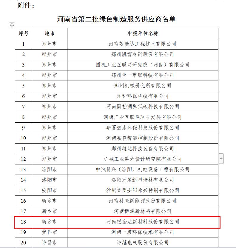 近日,河南省工信廳公示河南省第二批綠色制造服務(wù)供應(yīng)商名單,河南銀金達新材料股份有限公司在列。