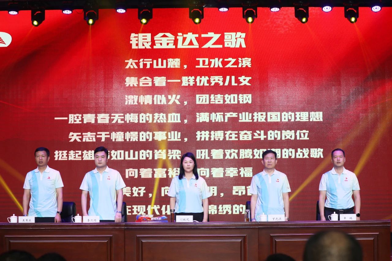 上午9:00,在唐莊干部教育學(xué)院主會(huì)場(chǎng),大會(huì)在莊嚴(yán)的國(guó)歌聲中正式拉開(kāi)帷幕。全體與會(huì)人員肅立合唱,愛(ài)國(guó)情懷與企業(yè)擔(dān)當(dāng)在旋律中交融。隨后,《銀金達(dá)之歌》的激昂旋律響起,唱出了銀金達(dá)人三十一年如一日的堅(jiān)守與豪情。